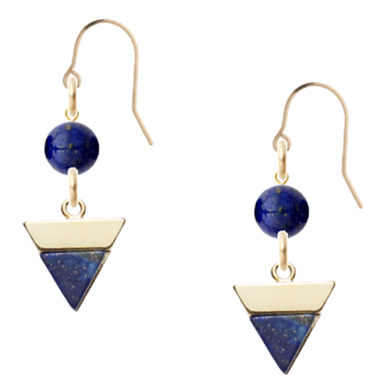 天然石ラピスラズリとラピスラズリ逆トライアングルチャームが付いた14金ゴールドフィルドのアレルギーの出にくいフックピアスです。