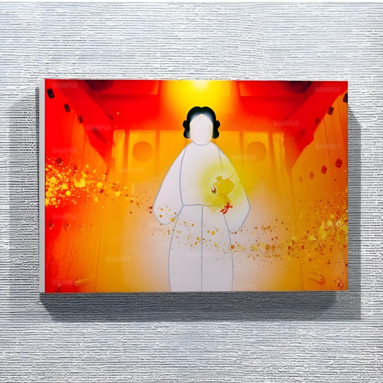 鮮やかな発色の昇華プリントで、ポリキャンバス生地を木枠に打ち付けて高級感のある仕上がりとなっています。背面はステープル張りで仕上げています。