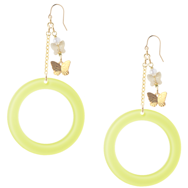 淡水パール(3.5㎜) &バタフライスワロフスキーチャーム(8㎜) とナチュラルテイストなバタフライチャーム、あずきフラットチェーン(2cm)にリバーシブルアクリルフープイエロー(裏面ブルー)が付いた、14金ゴールドフィルドのアレルギーの出にくいフックピアスです。