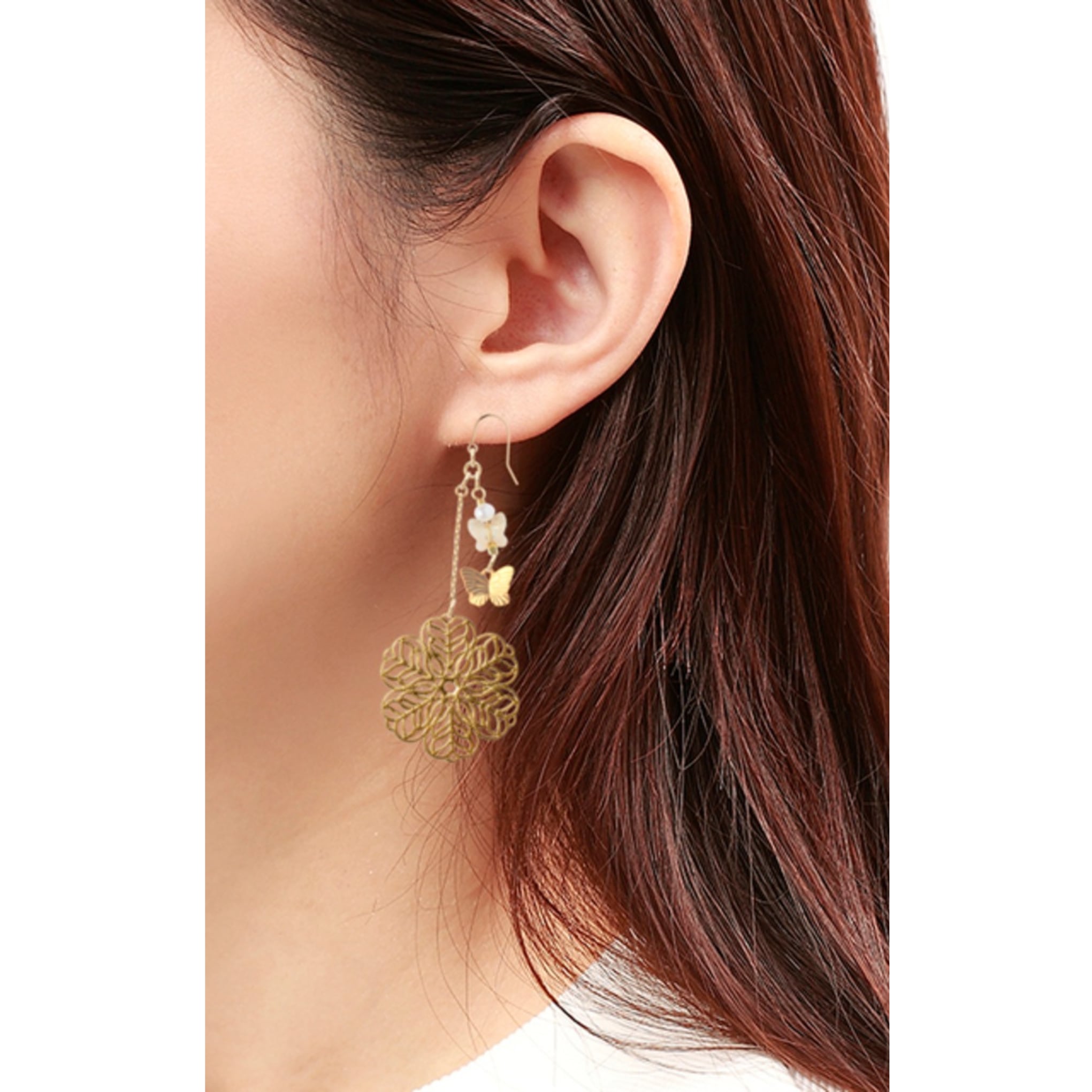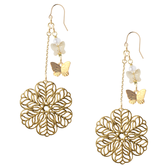 透かし六葉チャームと淡水パール(3.5㎜) &バタフライスワロフスキーチャーム(8㎜) 、ナチュラルテイスト蝶メタルチャームが付いた14金ゴールドフィルドのアレルギーの出にくいフックピアスです。